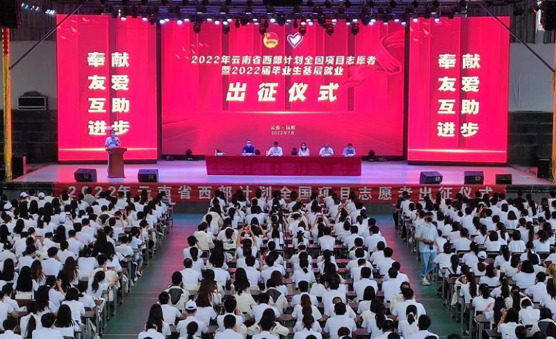 7月28日下午,2022年云南省大学生志愿服务西部计划志愿者出征仪式隆重举行。共青团省委副书记段胜忠出席仪式并讲话,代表西部计划实施单位向即将奔赴基层一线的西部计划志愿者们表示热烈欢迎,勉励志愿者们在推动云南高质量发展中,做一个信仰坚定的爱国者,要担当时代责任,勇于砥砺奋斗;要主动融入云南战略发展大局,做云岭巨变的“参与者”,为云南更美好的明天奉献才华、砥砺才干;要练就过硬本领,锤炼品德修为,磨练出能够战胜各种困难的坚强意志和宽广胸怀,以主人翁的精神全身心投入到工作中去,不断增强责任感和使命感;要树立“行行建功、处处立业”的观念,尽快适应岗位、踏实工作,将火热的青春献给基层,在为党和人民事业的不懈奋斗中努力成长。