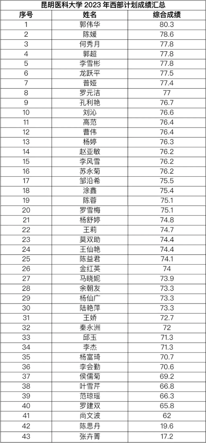 根据《关于做好2023--2024年度年大学生志愿服务西部计划相关工作的通知》安排,学校西部计划项目办分别于5月29日上午和下午组织开展了大学生志愿服务西部计划志愿者笔试、面试工作。共有43名志愿者参加笔试考试,41名志愿者参加面试。志愿者最终成绩=笔试成绩×40%+面试成绩×60%(满分100分),最终岗位匹配情况将根据云南省项目办具体岗位分配,以最终成绩排名的先后顺序以及志愿者意向服务情况进行岗位匹配,志愿者弃权的将顺位录取。现将参加考试学生最终成绩公布如下。