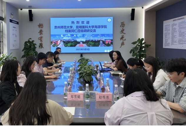 5月9日下午,贵州师范大学副馆长芦晓一行3人及beat365中文官方网站海源学院办公室主任葛牧一行9人到馆交流,档案馆馆长王媛携馆内工作人员予以热情接待。