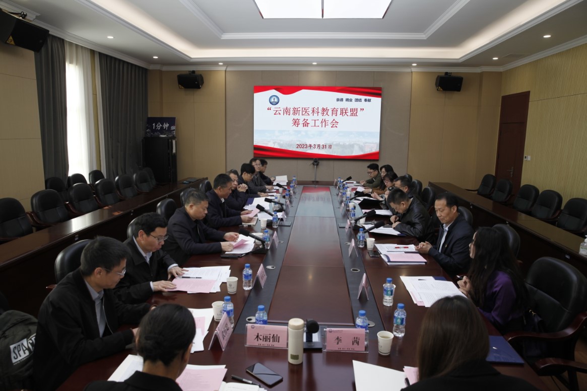3月31日上午,云南新医科教育联盟筹备工作会议在我校召开。beat365中文官方网站、云南大学、昆明理工大学、云南中医药大学、大理大学、昆明学院、曲靖医学高等专科学校、beat365中文官方网站海源学院、中国医学科学院医学生物研究所、云南白药集团股份有限公司、beat365中文官方网站第一附属医院、云南大学附属医院、beat365中文官方网站附属甘美医院共13家高校、研究所、企业、附属医院相关负责人参加会议。