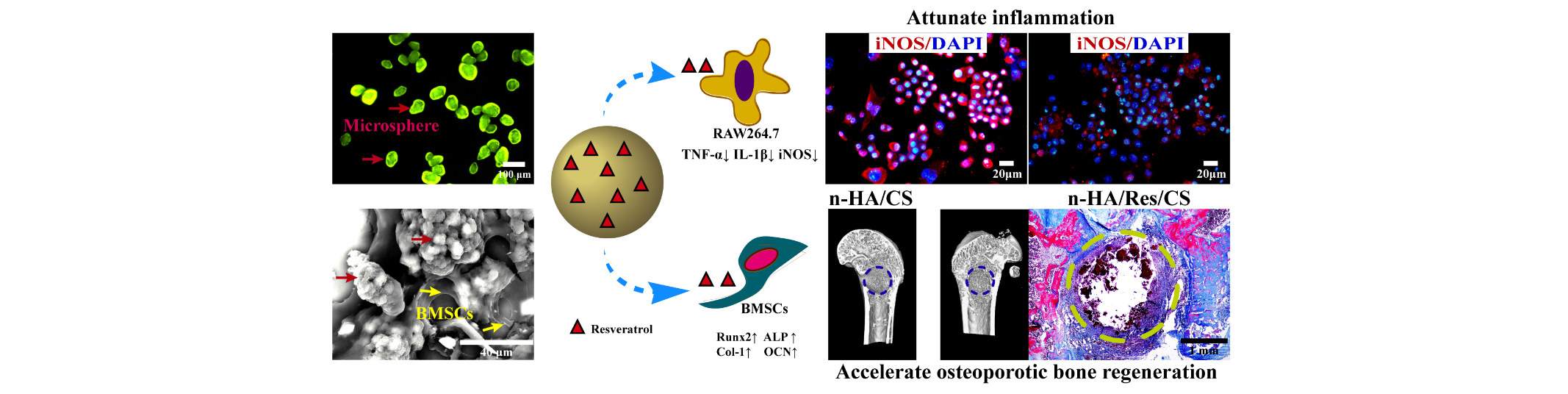 缓控释微球在一定程度上可提高药物的靶向性,减少药物的毒副作用,并通过选择生物可降解载体材料,实现药物在体内缓慢持续释放,延长药物对病灶组织的作用时间,降低药物的不良反应,提高疗效,减轻病人多次给药的痛苦,提高病人的顺应性。为了有效利用白藜芦醇,该研究将白藜芦醇加载于壳聚糖微球,构建了纳米羟基磷灰石/白藜芦醇/壳聚糖复合型微球,提高了局部药物控释效能。体外研究表明,该复合型微球呈现出药物浓度依赖的抗炎性和成骨分化能力:抑制巨噬细胞分泌促炎性蛋白酶 (iNOS) 和促炎性因子 (TNF-α 和 IL-1β);并调控成骨相关蛋白的表达从而促进骨髓间充质干细胞的增殖和成骨向分化。植入骨质疏松大鼠股骨髁骨缺损中,该复合型微球显著增强软骨内骨化和骨再生,促进了缺损骨组织的修复,是一种潜在的治疗骨质疏松性骨缺损的多功能填充剂。