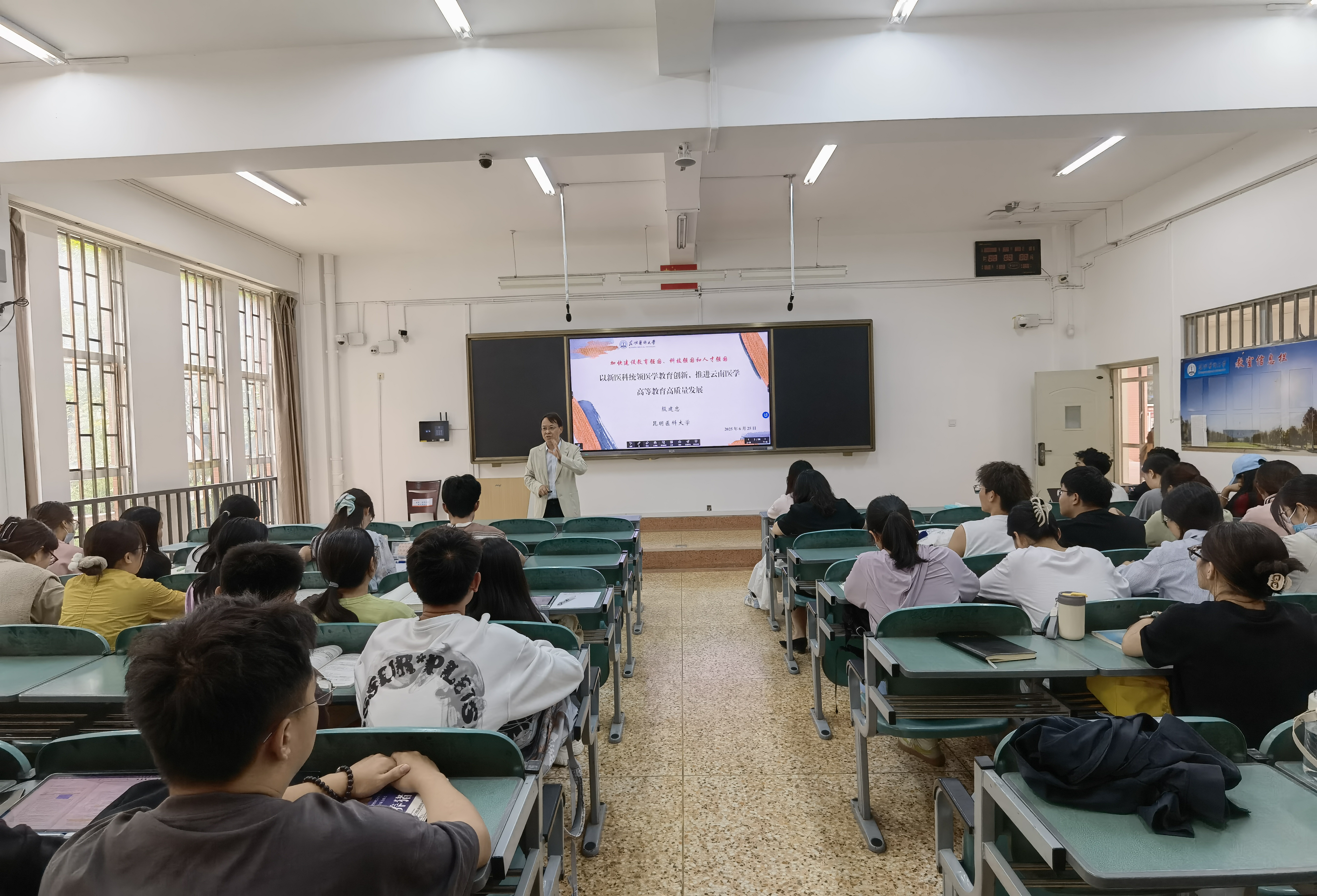 6月25日下午,beat365中文官方网站党委常委、副校长殷建忠走进2021级预防医学一、二大班课堂,为同学们讲授题为“加快建设教育强国、科技强国和人才强国——以新医科统领医学教育创新 推进云南医学高等教育高质量发展”的思政课。
