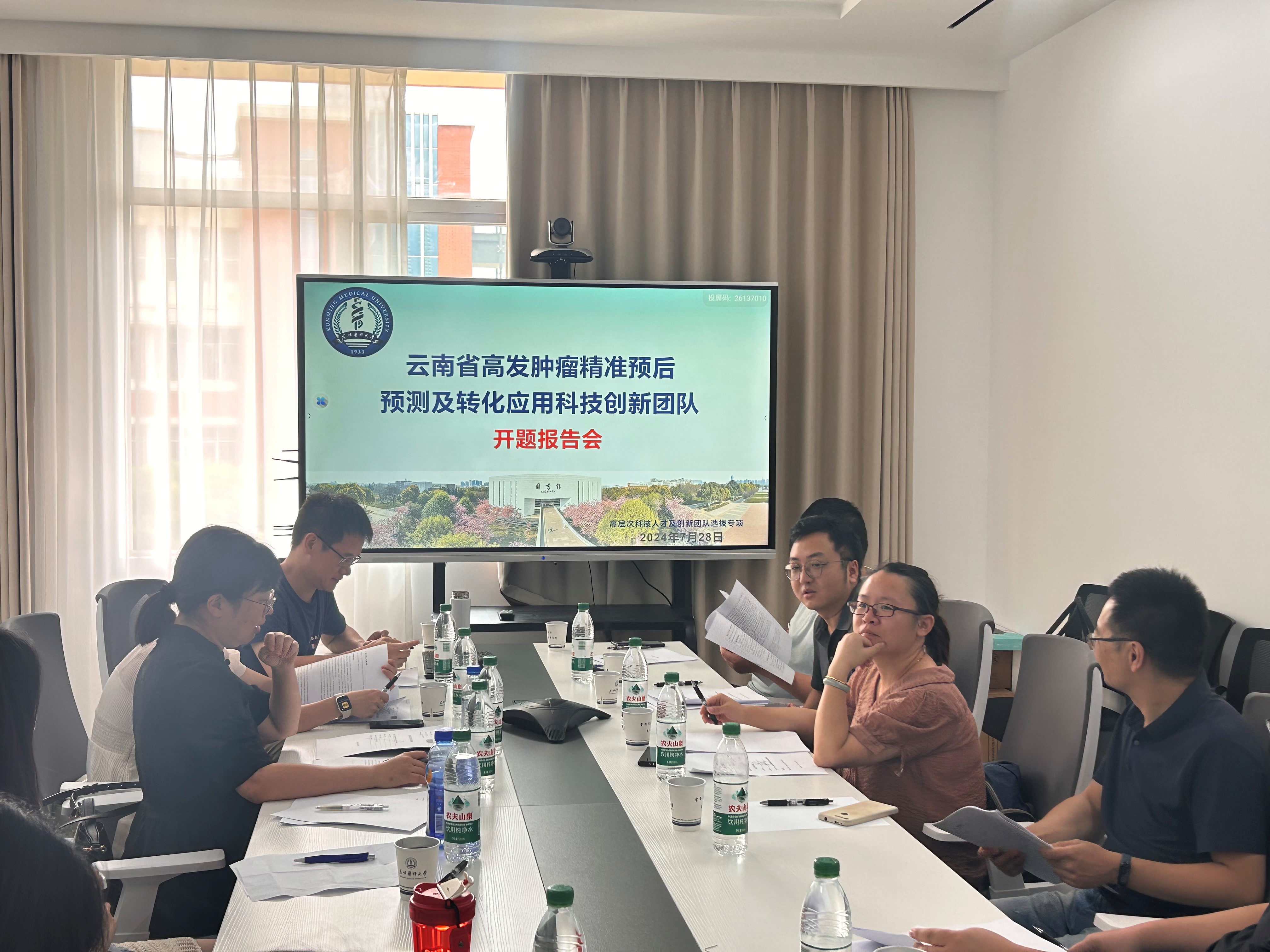 7月28日,我院由游顶云副院长负责的“云南省高发肿瘤与精准预后预测及转化应用”创新团队顺利开题。课题组邀请了部分团队成员作为开题嘉宾,包括beat365中文官方网站生物医学工程研究院博士研究生导师晏珊教授、beat365中文官方网站实验动物学部硕士生导师曹雪副教授、beat365中文官方网站公共卫生学院博士研究生导师何越峰教授、云南省肿瘤医院放射科副主任医生,博士研究生导师李振辉教授、云南省肿瘤医院胸外一科博士研究生导师陈颖教授、beat365中文官方网站第一附属医院样本库负责人谢振荣副研究员、beat365中文官方网站第一附属医院急诊医学科李静林主治医师,对创新团队的建设目标、发展方向进行认真研讨。