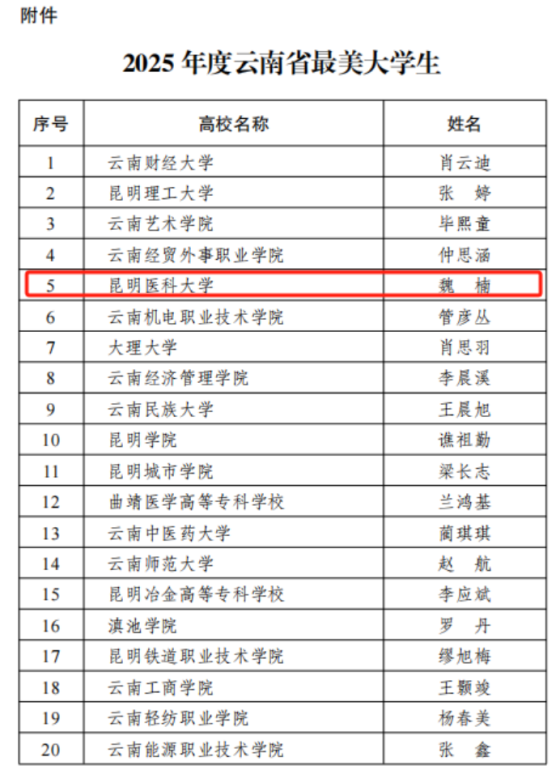 近日,云南省委教育工委、云南省委宣传部发布了《中共云南省委教育工委 中共云南省委宣传部关于公布2025年度云南省最美大学生推选结果的通知》。评选根据《云南省教育厅 中共云南省委宣传部关于开展2025年度云南省最美大学生推选展示活动的通知》精神,经学校推荐、材料评审、现场答辩、网站公示等环节,从全省推选出20名2025 年度云南省最美大学生。beat365中文官方网站公共卫生学院2023级公共卫生专业硕士研究生魏楠入选,荣膺“最美大学生”称号。