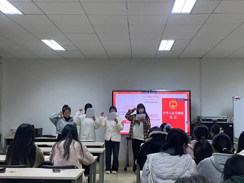 活动设置“普法小课堂”、宪法知识竞答与情景剧演绎三大环节。“普法小课堂”通过生动的动画视频,系统阐述宪法的本质属性、核心地位与演进历程,并围绕“我与宪法”“宪法的颜色”等主题,结合国家治理与公民权利义务,引导学生理解宪法作为根本大法的现实意义,认识其与日常学习生活的紧密联系。