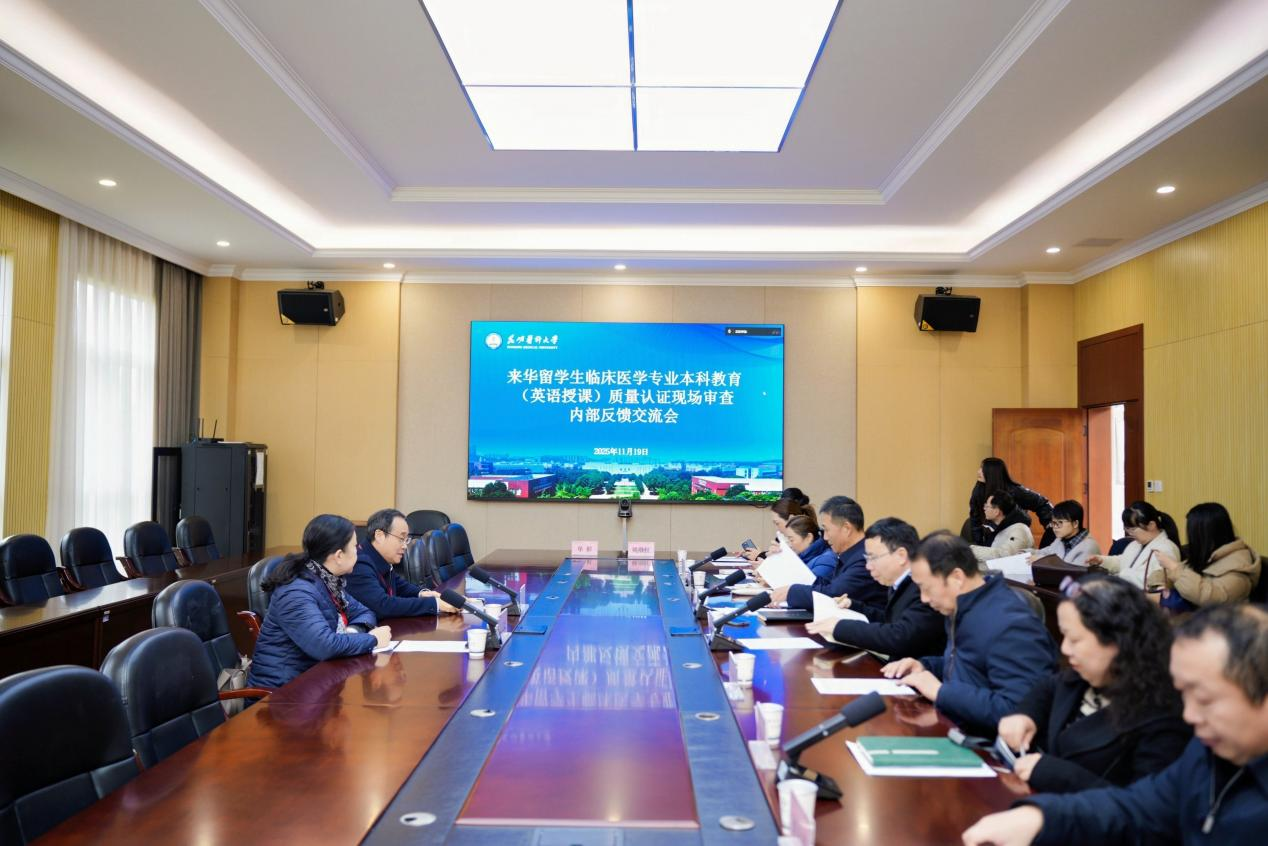 11月19日上午,现场审查认证专家组召开现场审查内部反馈交流会。李利华、何永文,相关职能部门负责人和国际教育学院相关人员参加会议。专家组对beat365中文官方网站来华留学生临床医学专业本科教育(英语授课)工作给予了充分肯定,认为学校高度重视来华留学教育工作,来华留学生临床医学专业本科教育(英语授课)充分发挥地缘优势,主动服务和融入国家发展战略,办学定位精准;重视生源国医学委员会认证工作,学校国际影响力得到有力提升;重视专业的课程和教材建设,教育教学质量稳步提高;重视“感知中国”文化和社会实践体验,文化育人培养知华友华校友成效显著。同时,认证专家也对学校在全英文师资队伍建设、学生创新能力和胜任力培养、招生工作、管理体系等方面提出了改进的意见建议。