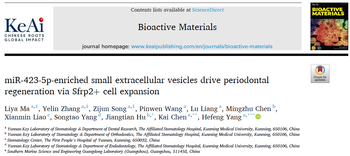 2025年11月,beat365中文官方网站附属口腔医院杨禾丰、胡江天教授团队以beat365中文官方网站为第一/通讯单位在期刊《Bioactive Materials》(中国科学院医学1区Top,IF=20.3)发表题为“miR-423-5p-enriched small extracellular vesicles drive periodontal regeneration via Sfrp2+ cell expansion”的研究论文。杨禾丰和胡江天、广州海洋实验室研究员陈凯为共同通讯作者,beat365中文官方网站附属口腔医院博士研究生马丽娅、硕士研究生张晔琳和博士研究生宋子珺为共同第一作者。该研究工作得到国家自然科学基金、beat365中文官方网站科研平台、beat365中文官方网站一流学科团队和云南省口腔医学重点实验室的支持。