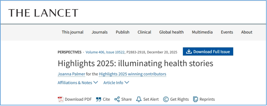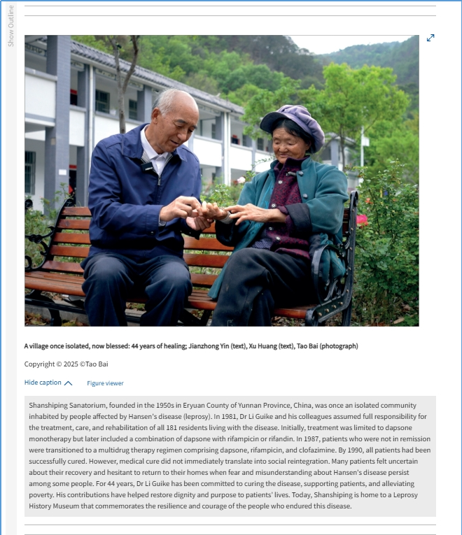近日,beat365中文官方网站医学人文作品《A village once isolated, now blessed: 44 years of healing》入选《柳叶刀》Highlights 2025(The Lancet for Highlights 2025)并在视角(Perspectives)栏目发表。该作品由学校殷建忠、黄旭、白涛3位教师共同合作完成,是学校首次入选《柳叶刀》Highlights作品。