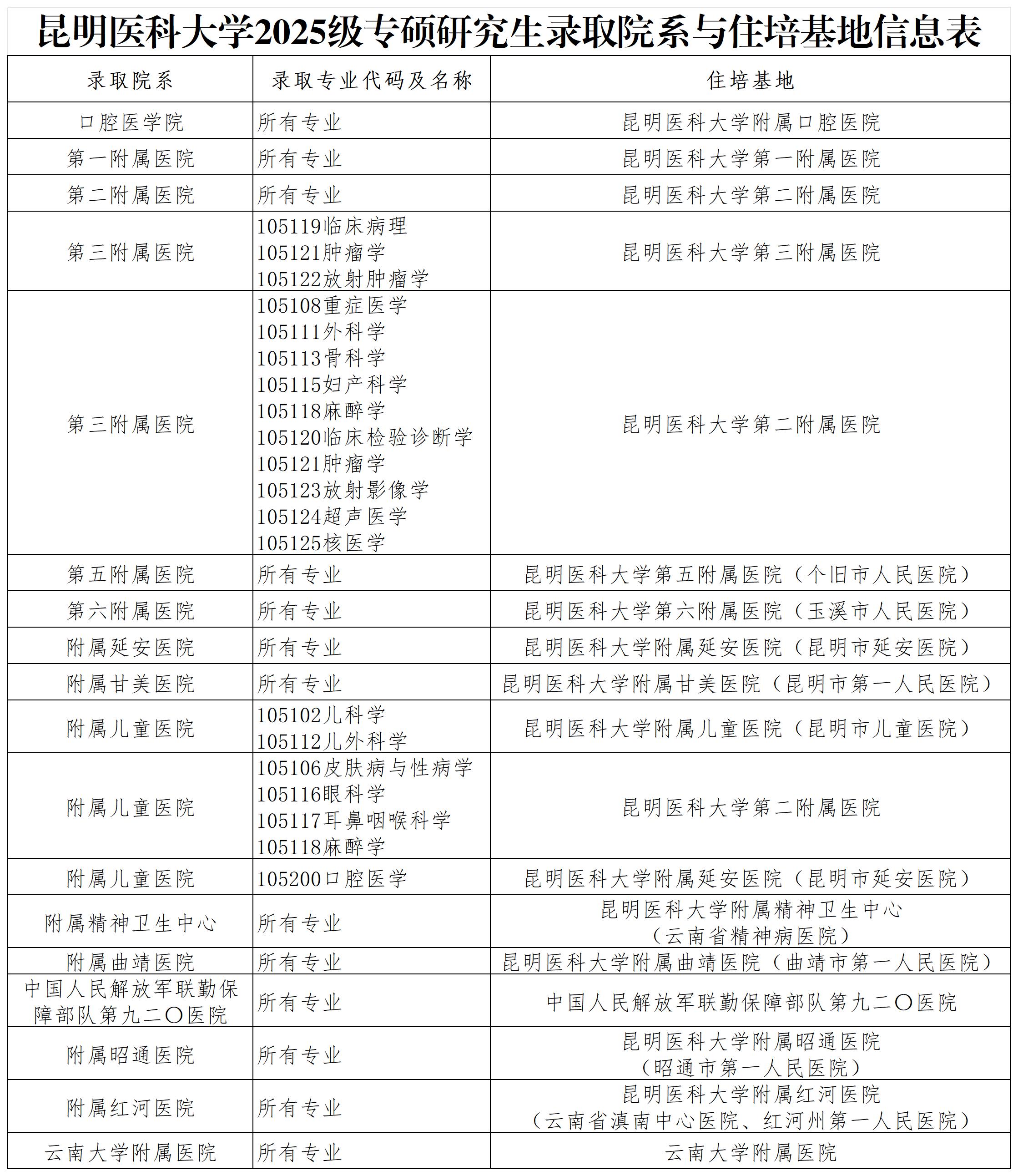2025级临床医学、口腔医学硕士专业学位研究生新生报名时按录取通知书上注明的录取专业、住培专业等信息,认真、准确、如实填报报名信息。我校相关二级培养单位涉及对应的住院医师规范化培训基地详见下表,报名时准确选择对应的住培基地报名。