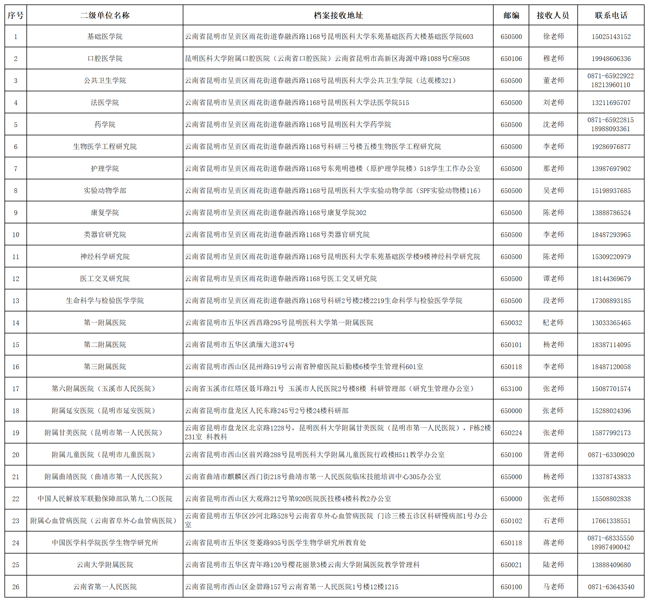 (一)录取类别为“全日制非定向”考生可于2025年6月30日(星期一)11:00后登录“beat365中文官方网站博士研究生招生管理系统”(https://kybs.kmmu.edu.cn),通过“调档函打印”模块下载打印本人《调档函》,按照本人人事档案所在单位全称填写调档函抬头,按照调档函上的档案寄送地址自行将档案寄送至拟录取的二级研究生培养单位(具体详见下表)。不需填写《beat365中文官方网站研究生考生思想政治及工作表现情况调查表》。如需盖红章的调档函原件,请考生与研究生招生办公室联系。“硕博连读”拟录取考生不需调取档案。