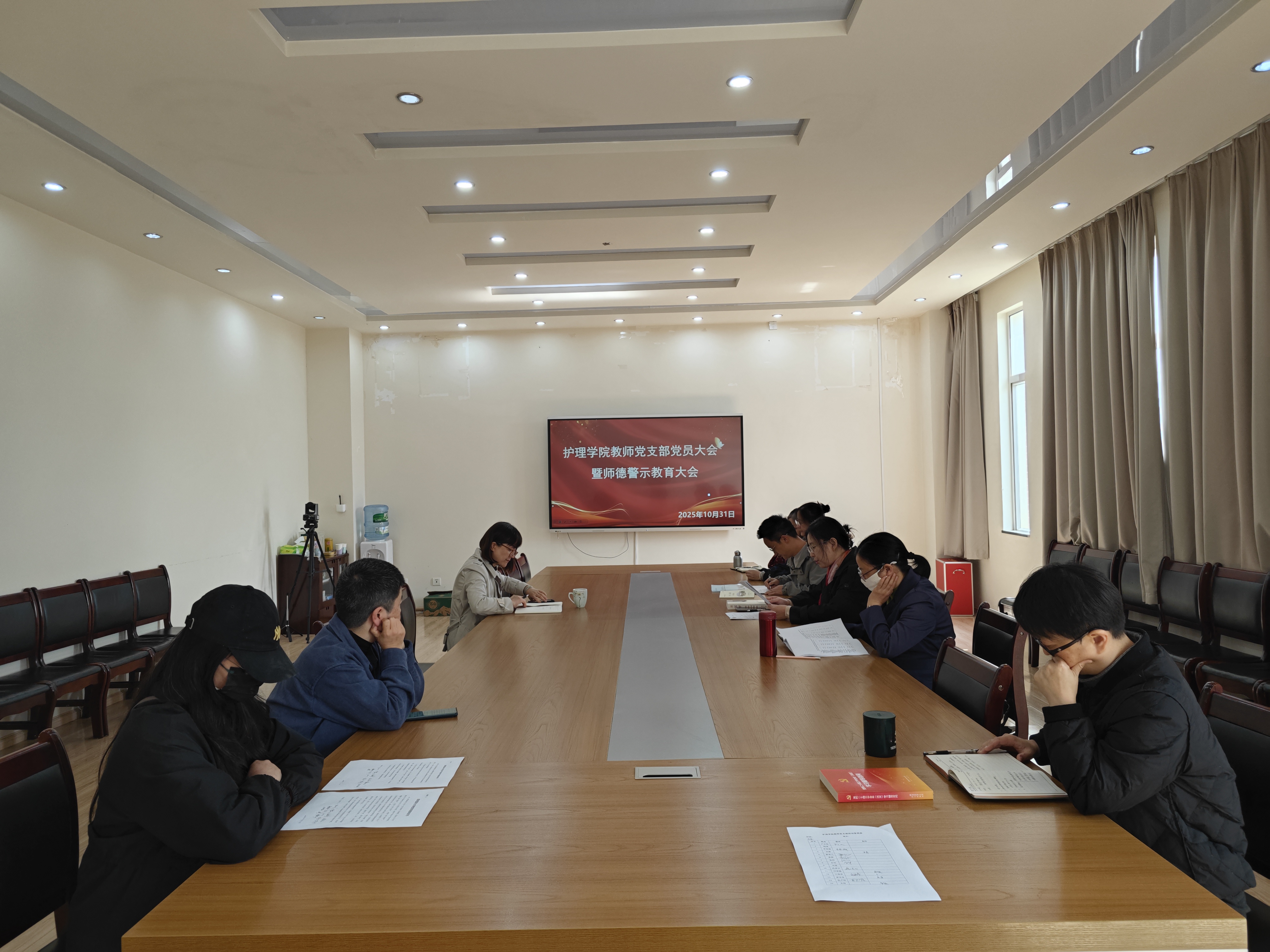 为深入贯彻落实习近平总书记关于教育的重要论述,强化高校教师队伍师德师风建设,2025年10月31日,护理学院教师党支部在明德楼502会议室召开师德警示教育党员大会,会议由党支部书记王海彦主持。