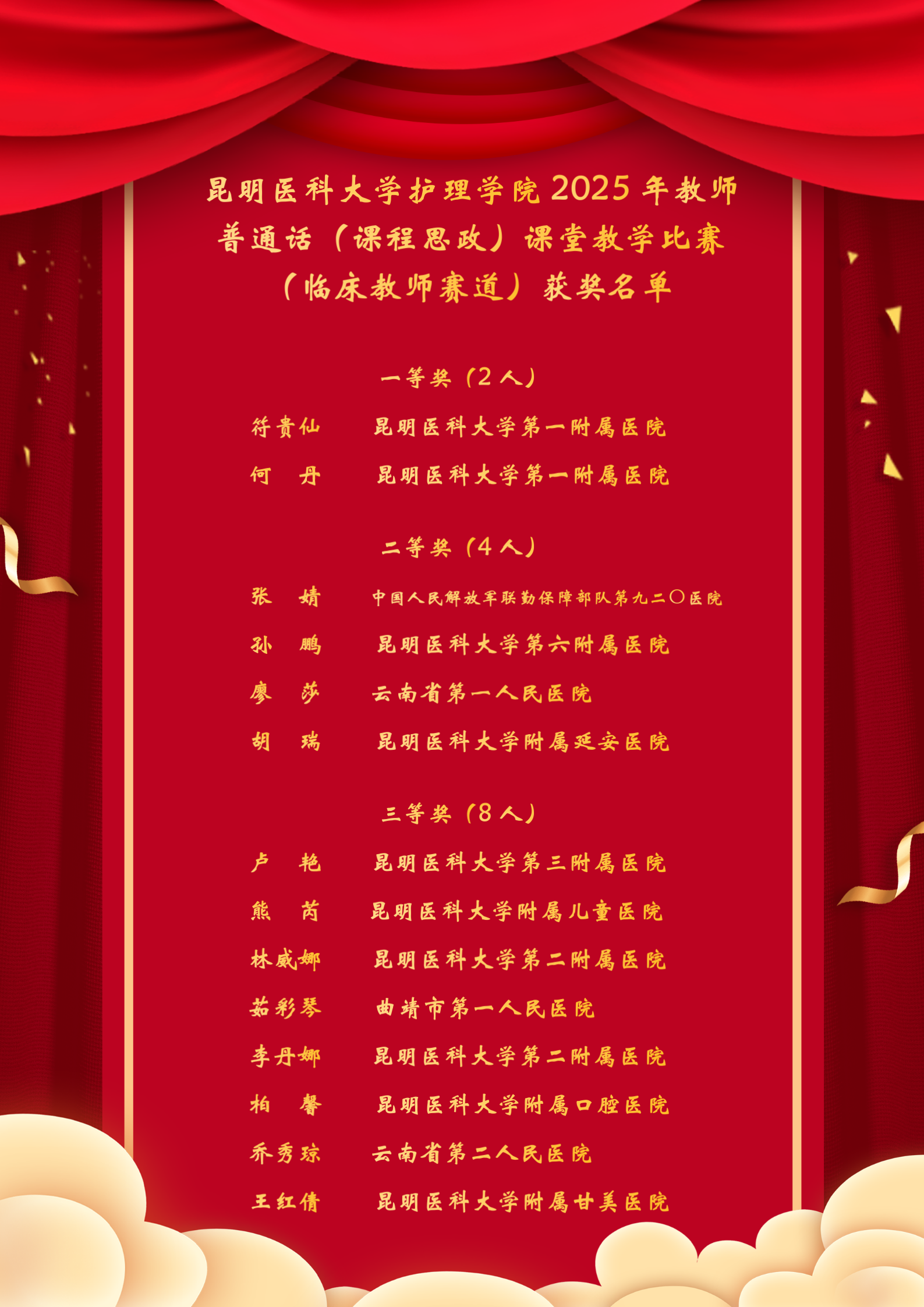 护理学院2025年教师普通话(课堂思政)课堂教学比赛(临床教师赛道)于5月21日在明德楼401教室举行。云南省教学名师郭泽云教授担任评委组组长,beat365中文官方网站教学督导委员会委员梁桂仙教授、基础医学院教授委员会原主任委员龙莉教授、护理学院教学督导委员会委员范萍副教授和徐正英副教授担任评委,来自12家实践教学单位的14名临床教师参加了比赛。