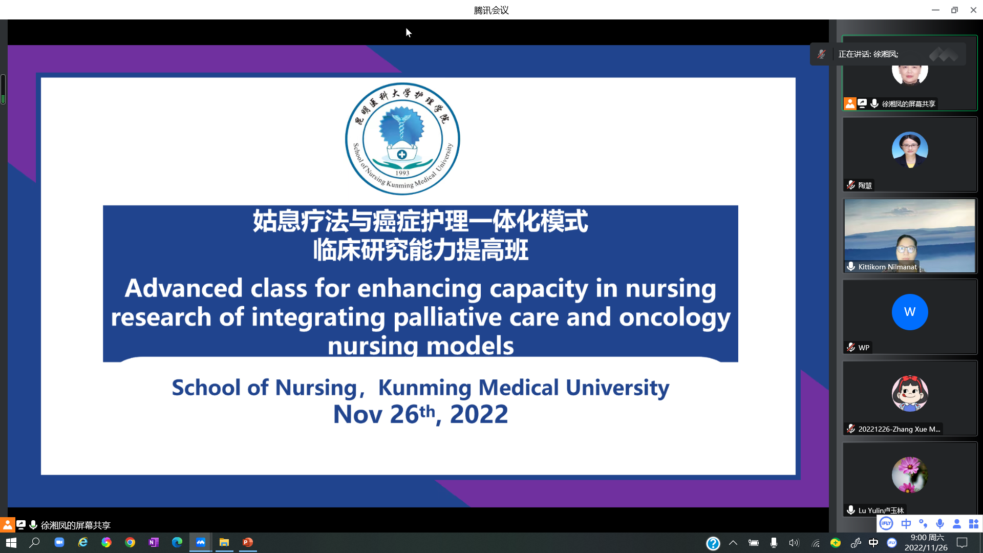 在学校对外合作交流处以及学院领导和老师的支持下,由学院徐湘凤老师主持申报的线上学术交流项目《护理研究质量提高班》和《姑息疗法与癌症护理一体化模式临床研究能力提高班》先后于2022年11月19日和11月26日顺利开班。