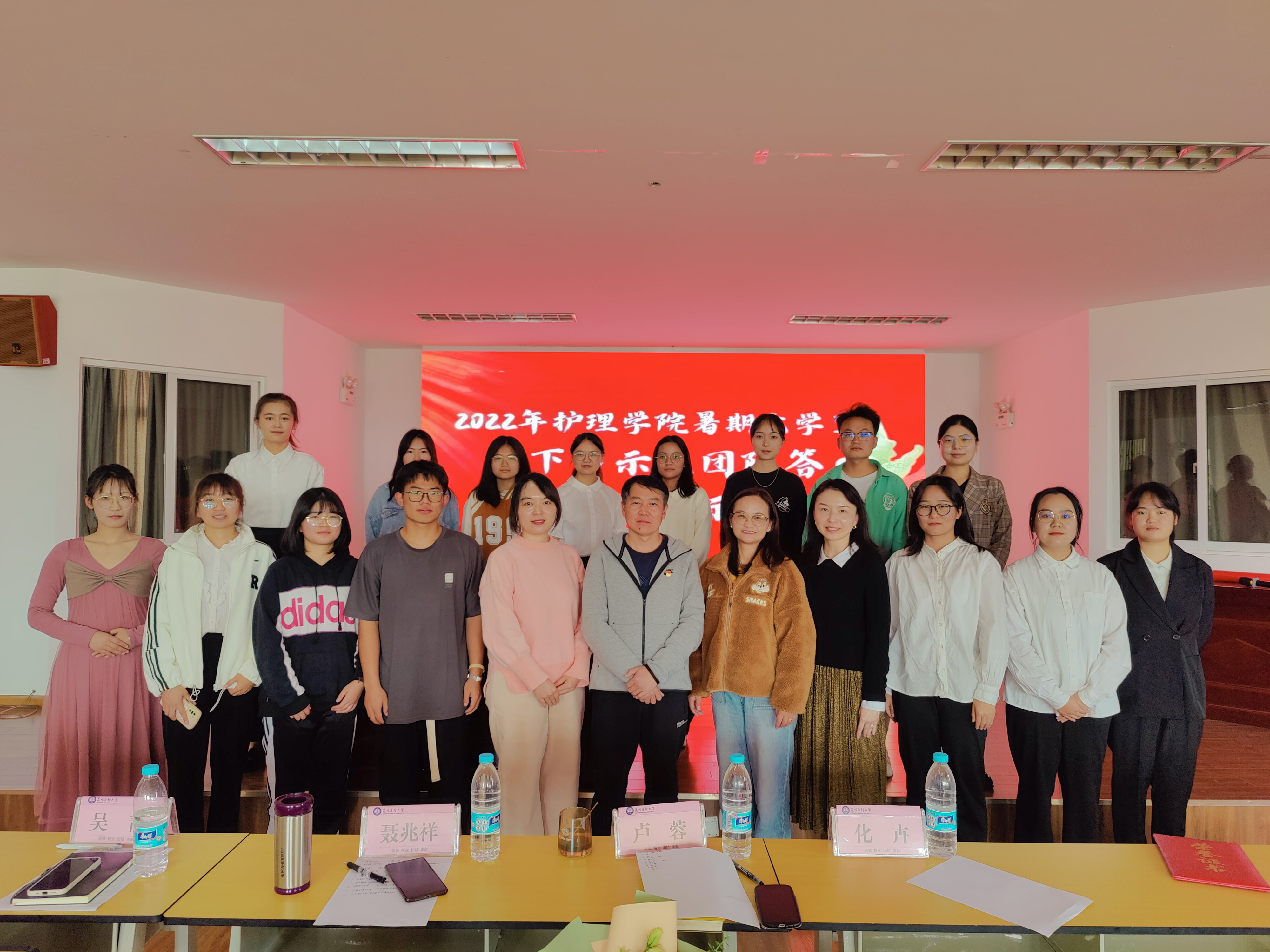 2022年10月21日,beat365中文官方网站护理学院2022年暑期大学生“三下乡”示范团队答辩暨成果展示活动在护理学楼501报告厅举行,共10支院级示范团队参加本次活动。本次活动由护理学院团委主办,护理学院党委副书记聂兆祥、学院党政办主任、学生第二党支部书记吴青、学生工作办公室主任卢蓉、团委书记化卉、学科科研及研究生管理办公室教师文信到场担任评委,各立项团队全体成员、院团学骨干代表参与活动。