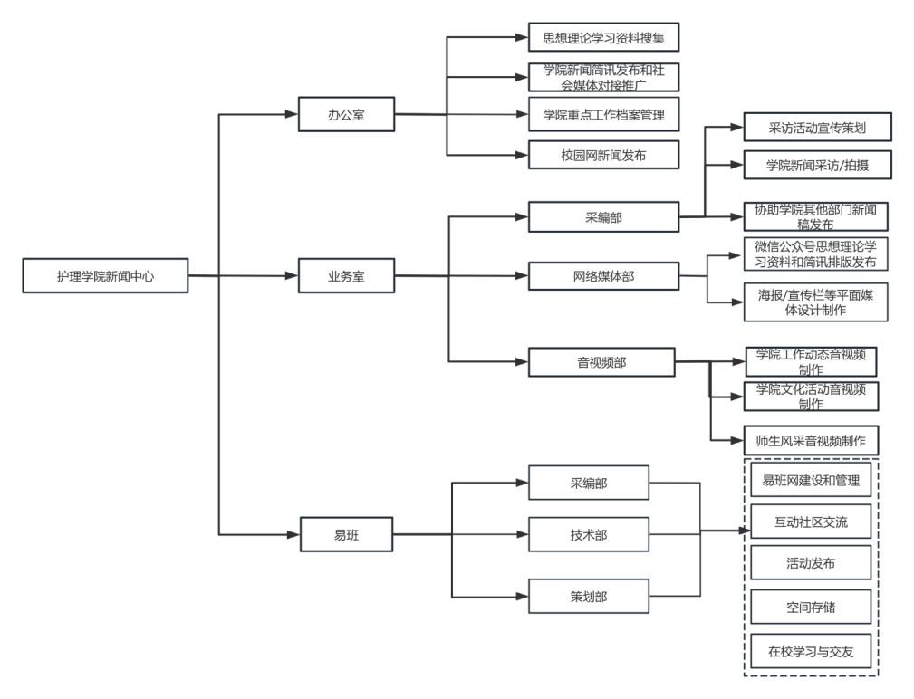 学院新闻中心由学院党委直接领导,聚焦学院思想理论学习和学院工作动态宣传报道。通过融合传统媒体和新媒体资源,主要负责党的创新理论在学院新媒体平台上的传播学习、学院新闻资料的采编和校园网、微信公众号、易班上的发布。新闻中心下设三个职能部门:办公室、业务室(采编部、网络媒体部、音视频部)、易班。新闻中心由学院分管意识形态工作的党委副书记负责,设主任1名,由学院宣传委员兼任;副主任1名,由学院团委书记兼任。具体分工如下: