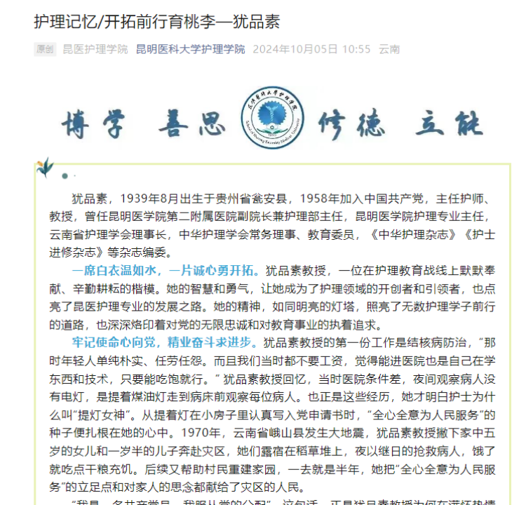 精准滴灌、润物无声,学生也积极响应号召,发挥自我教育功能,结合各自专业特色创作网络优秀作品。如《担当健康卫士使命,落实健康中国行动》体现了医学生对健康中国战略的深刻理解与实践行动,《提灯女神心向党,开拓前行育桃李——专访犹品素教授》则通过访谈形式,展现了老一辈教育工作者的奉献精神与对党的忠诚,为青年学生树立了学习榜样,同时该推文获云南省教育厅关工委2024 年“读懂中国”活动征文一等奖。这些作品以鲜活的案例传递护理价值,引发师生共鸣,成为网络育人的优质内容源泉。