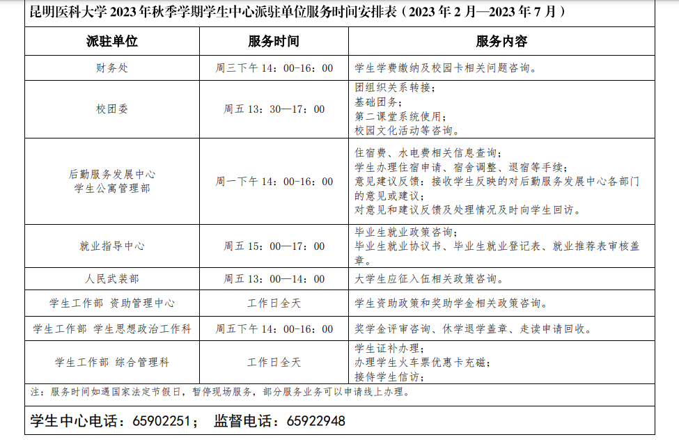 学生中心服务内容及相关事项,参照附件《beat365中文官方网站2023年春季学期学生中心派驻单位服务时间安排表。