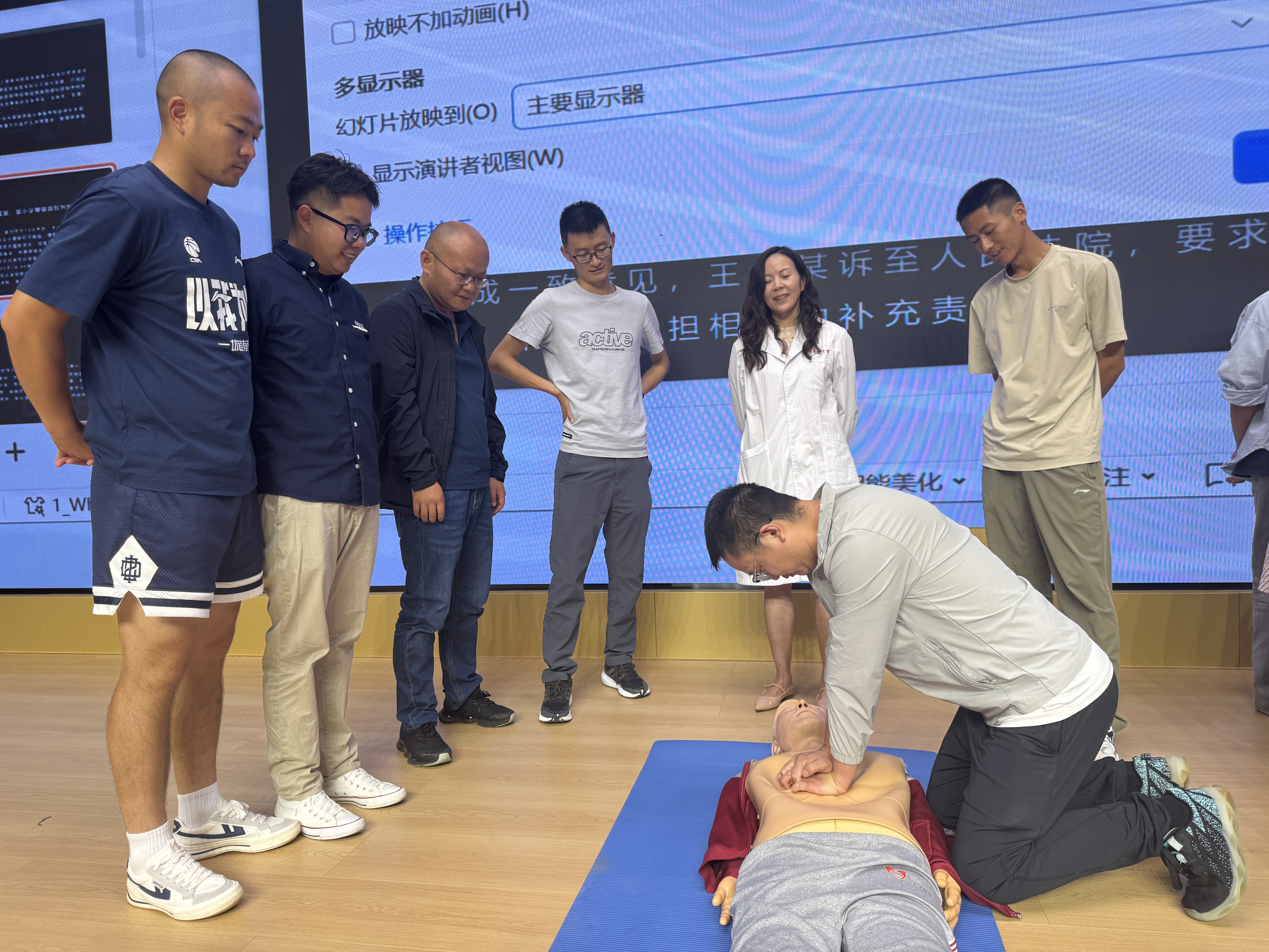 中心教师团队采用理论授课的方式讲解了应对校园常见突发意外伤害的急救知识,包括常见意外伤害急救方法、心肺复苏和AED使用、海姆立克急救法、包扎止血和骨折固定等内容,并现场分组指导参训教师利用专业模拟人进行实操练习。