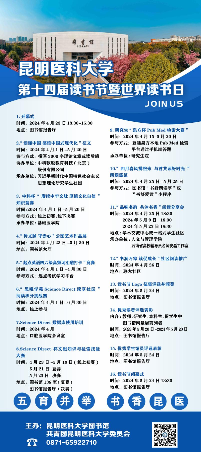 据悉,学校第十四届读书节暨世界读书日活动由学校图书馆、校团委联合主办,校学生会承办,活动共有14个读书系列活动,包含征文大赛、文献知识检索大赛、文化知识竞赛、艺术作品展、读书节logo征集大赛、读书分享会等丰富多彩活动,时间持续30天至5月底结束,读书节活动的举办旨在号召师生积极参与阅读,加强学风建设,不断提升人文素养,共建书香校园。