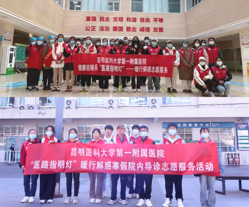 2024年2月初,于春节前夕,beat365中文官方网站第一附属医院“医路指明灯”暖行解惑寒假院内导诊陪诊社会实践及志愿服务活动迎来收官。本次活动为期一个月,61名本校医学生、5名外校大学生志愿者遍布beat365大附一院西昌路院区与呈贡院区29个社会实践岗位,为近5万人次的患者提供了暖心高效的院内导诊陪诊志愿服务。